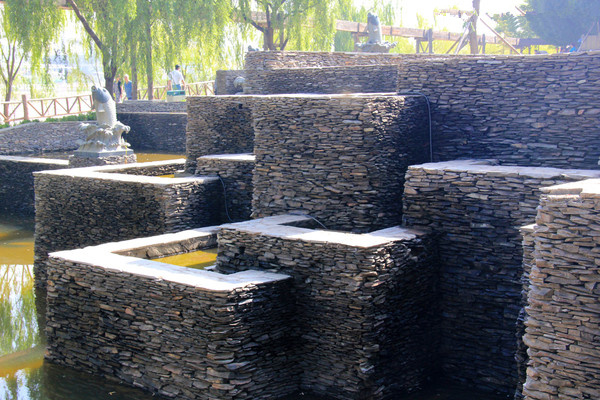 (8)不同水體形態(tài)之間以及水體和其他元素的結(jié)合使用可豐富環(huán)境的多樣性。設(shè)計(jì)中通常是多種形式的水體組合使用,如跌水和靜水的結(jié)合、噴泉和跌水的結(jié)合等;也要注意水體和植被、山石等元素結(jié)合起來(lái)設(shè)計(jì);還要考慮與水生動(dòng)植物的結(jié)合,各種不同的動(dòng)植物,如水中的荷蓮、水邊的蘆葦、各種魚(yú)類(lèi)等,這樣既能體現(xiàn)生物的多樣性,也能增加空間的趣味性。