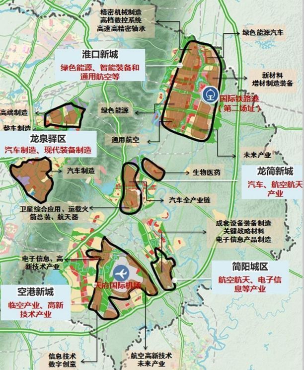 空港新城:臨空產業、高新技術產業,包含電子信息、信息技術數字創意、航空高新技術未來產業等