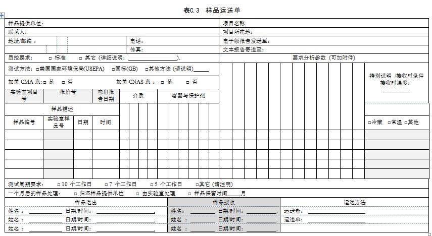 每份樣品從采樣到送至實驗室都應該有一個完整的樣品追蹤監(jiān)管程序,主要包括:樣品的收集、運輸、處理和相關人員的信息;樣品采集日期、時間、深度等記錄數(shù)據(jù);樣品分析項目等其他信息。樣品流轉清單樣式可參考表C.3。