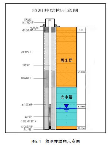 井管應由井壁管、過濾管和沉淀管等三部分組成。井壁管位于過濾管上,過濾管下為沉淀管。過濾管位于監(jiān)測的含水層中,長度范圍為從含水層底板或沉淀管頂?shù)降叵滤灰陨系牟糠郑灰陨系牟糠忠诘叵滤粍討B(tài)變化范圍內;沉淀管的長度一般為50cm~60cm,視隔水層的厚度而定,沉淀管底部須放置在隔水層內。地下水監(jiān)測井示意圖見圖E.1。