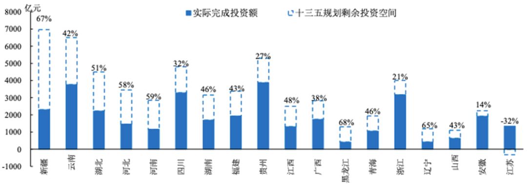 中西部省份十三五公路剩余規劃空間較大,江蘇、安徽、浙江已經超額或者大幅完成十三五目標