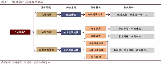 過去30年,中國城鎮化取得了跨越式發展,工業化水平也不斷提升,相應的交通、能源基礎設施投資經歷了快速發展。但由于市政基礎設施建設相對滯后,交通擁堵、空氣污染、環境污染、固廢堆積等“城市病”日益嚴重。為治理“城市病”,近年來市政建設占基建投資的比重已從2002年的7.5%提升至2017年的47.4%,未來這一趨勢有望延續,投資的重心預計在城軌建設、地下空間建設和生態環保建設3個方面。