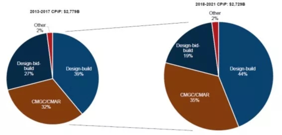 根據(jù)美國(guó)設(shè)計(jì)建造學(xué)會(huì)和FMI咨詢公司的研究,2013年到 2017年期間,美國(guó)工程建設(shè)市場(chǎng)上DB模式占比最高,達(dá) 39%;2018年到2021年的預(yù)測(cè)表明,DB模式占比將進(jìn)一步擴(kuò)大,達(dá)到44%。