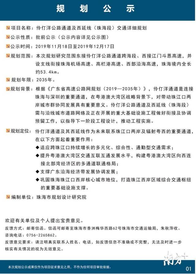 18日,珠海市交通運輸局官網(wǎng)公布關(guān)于《伶仃洋公路通道及西延線(珠海段)交通詳細規(guī)劃》(下稱《規(guī)劃》)公開征求意見的公告,向社會征求意見意見和建議。