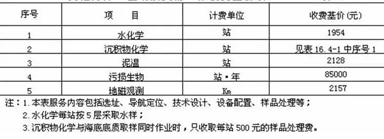 在《工程勘察收費標準》里,除了看2.3節(jié)里的“水域測量”部分外,還需要關(guān)注第16部分的“海洋工程勘察”部分,該部分對多波束海底地形測量,海底面狀況掃側(cè),底質(zhì)取樣,氣象、潮位、波浪觀測,海流、鹽度、泥沙觀測,海洋工程地質(zhì)鉆探,海底地層測量,及其他海洋工程勘察項目,等等都作出了勘察收費依據(jù)。這里,海底面狀況掃側(cè)是指掃海測量,海底地層測量可以對應(yīng)淺地層剖面測量。而海底地層測量又細分聲學(xué)地層探測、單道地震探測及多道地質(zhì)探測三類。在其他海洋工程勘察項目部分中,地磁觀測可以與海洋磁力測量對應(yīng),另外還包括沉積物化學(xué)、污損生物、水化學(xué)等內(nèi)容。