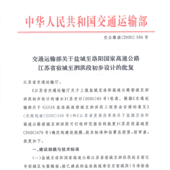 鹽洛高速公路宿城至泗洪段初步設(shè)計(jì)獲交通運(yùn)輸部批復(fù)