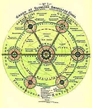 霍華德在世紀(jì)之交時(20世紀(jì)初)提出一個解決工業(yè)城市擁擠和嚴(yán)重污染的方法,他的解決方案的核心是在永久的綠化帶中創(chuàng)造一個集中在通過運河和交通工具連接起來的更小的“花園城市”(每個城市有3.2萬人)。