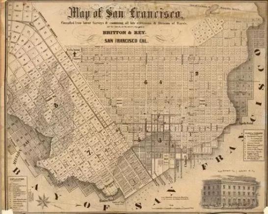 1811年曼哈頓專員的計劃試圖建立一個嚴(yán)格的街道網(wǎng)格,以發(fā)展島上的其他地區(qū)。幾十年后,這幅1852年的地圖顯示舊金山也做了同樣的事情,為了出于方便忽略了這個城市不規(guī)則的海岸線和地形。