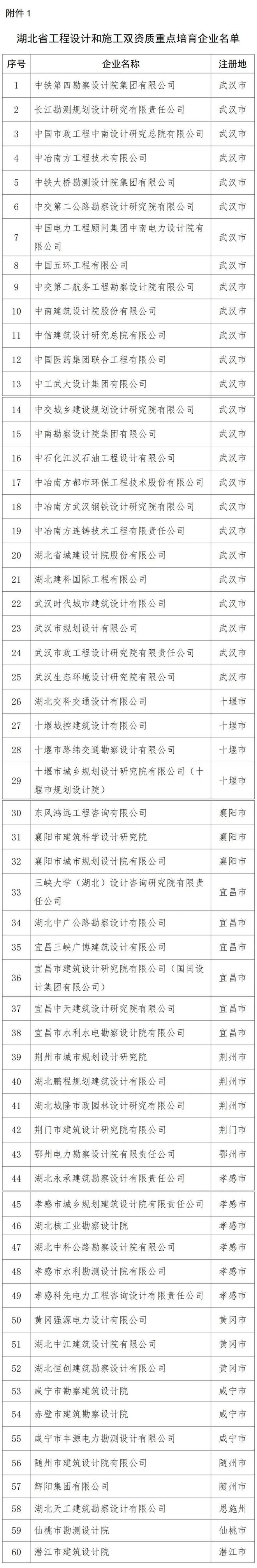 為貫徹落實《關(guān)于促進全省工程勘察設(shè)計行業(yè)高質(zhì)量發(fā)展的若干措施》(鄂建文〔2022〕9號),培育同時具備設(shè)計資質(zhì)和施工資質(zhì)的骨干建筑企業(yè),促進工程設(shè)計與施工融合發(fā)展,更好實施工程總承包模式,深化工程建設(shè)組織方式改革。經(jīng)企業(yè)自愿申請、市州審核推薦、省廳綜合審定、依法公開公示,現(xiàn)正式公布湖北省工程設(shè)計和施工雙資質(zhì)重點培育企業(yè)名單,并就有關(guān)事項通知如下: