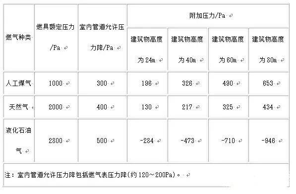 燃氣種類 燃具額定壓力/Pa 室內管道允許壓力降/Pa 附加壓力/Pa 建筑物高度為24m 建筑物高度為40m 建筑物高度為60m 建筑物高度為80m 人工煤氣 1000 300 196 326 490 653 天然氣 2000 400 130 217 325 434 液化石油氣 2800 500 -284 -473 -710 -946 注:室內管道允許壓力降包括燃氣表壓力降(約120~200Pa)。