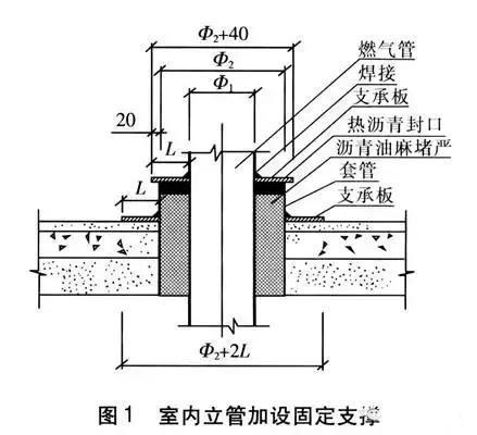 ① 對于室內立管,在每隔7~10層的穿樓板處加設固定支撐,使燃氣管道、套管以及建筑物成為一體。具體做法見圖1(圖中單位為mm)。