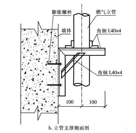 隨著建筑物層數的增加,燃氣立管的長度也變長,管道的自重變大,所以應設置管道的固定支架,使固定支架與建筑物成為一體,防止因管道下沉而引起引入管受力折斷或變形引起倒坡。一般固定管道的做法有: