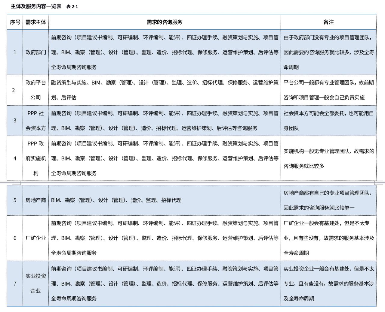 不同的投資主體對全過程咨詢需求的服務(wù)內(nèi)容是不一樣的,一是因為投資主體本身性質(zhì)的不同,法律法規(guī)所規(guī)定的也不一樣,二是投資主體自身團隊管理水平的因素所需求的咨詢服務(wù)也不一樣,以下通過表格列述不同的主體所需求的咨詢服務(wù):