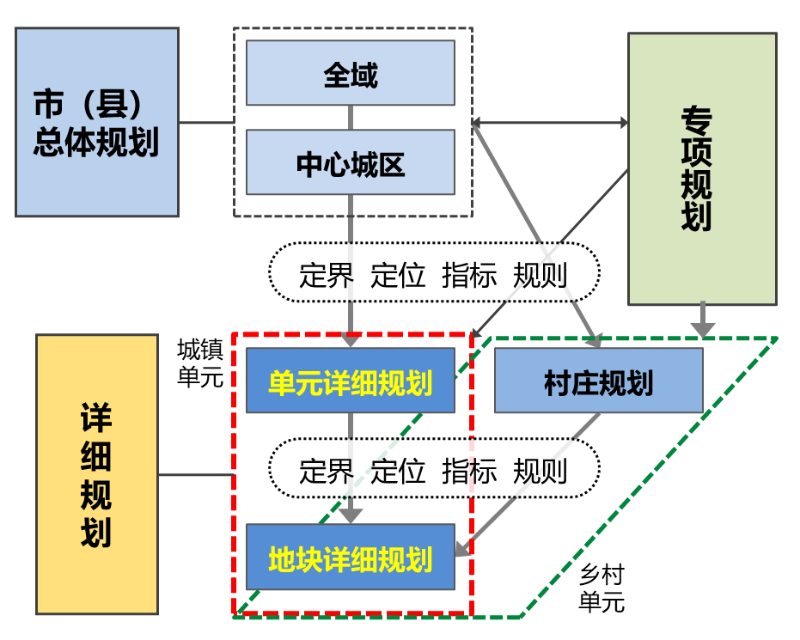 ?。ㄒ唬┲貥嫛爸行某菂^—單元—地塊”傳導層級。針對原控規承接傳導體系不健全情況,依據國土空間總體規劃,立足城鎮開發邊界和中心城區關系,重構“全域空間—中心城區—單元—地塊”多層級、全覆蓋的傳導體系。明確單元作為市、縣國土空間總體規劃向詳細規劃傳導規劃內容和要求的空間載體,是詳細規劃編制、管理、實施和監督的基本單位,在國土空間總體規劃階段劃定。地塊則是詳細規劃管理和項目實施單位。