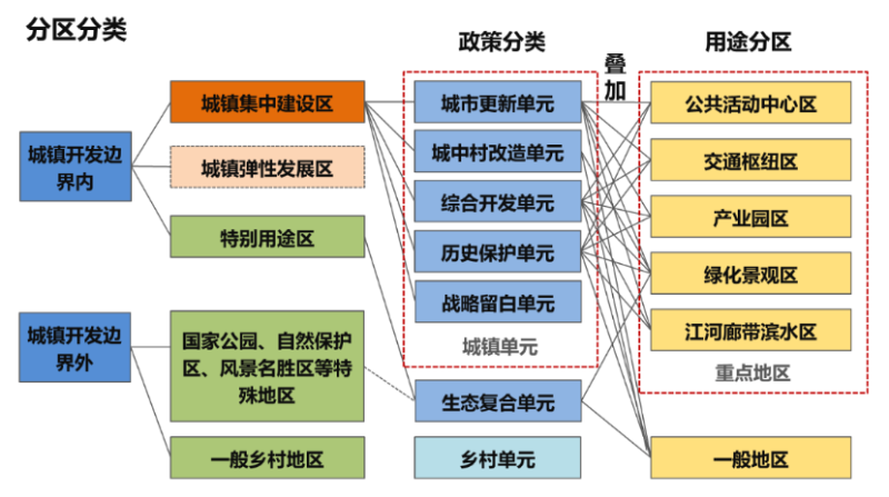 ?。ㄒ唬┐罱ㄓ猛痉謪^疊加分類政策多場景。立足國土空間全域全要素規劃管控要求,協調城鎮開發邊界內外關系,劃分一般用途區和重點用途區,其中重點區包括公共活動中心區、交通樞紐區和江河廊帶濱水區等。在用途分區基礎上,疊加各類政策,明確城市更新、城中村改造、綜合開發、歷史保護、生態復合和戰略留白等類型單元,進行分區分類指引,實現土地利用全生命周期、全利用方式的管控,保障相關政策得以落地。