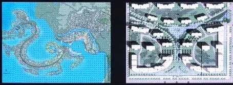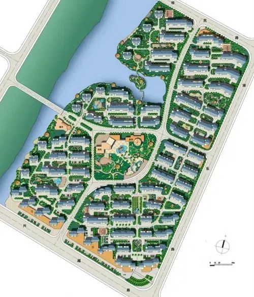用地中間做環形道路,向外引出錯落的分支道路,形成各自獨立的組團,中心適宜做景觀。