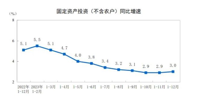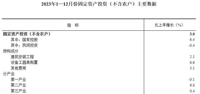2023年,全國固定資產(chǎn)投資(不含農(nóng)戶)503036億元,比上年增長3.0%(按可比口徑計算),增速比1—11月份加快0.1個百分點。其中,制造業(yè)投資增長6.5%,增速加快0.2個百分點;基礎(chǔ)設(shè)施投資(不含電力、熱力、燃氣及水生產(chǎn)和供應業(yè))增長5.9%,增速加快0.1個百分點。從環(huán)比看,12月份固定資產(chǎn)投資(不含農(nóng)戶)增長0.09%。2023年,民間固定資產(chǎn)投資253544億元,比上年下降0.4%,降幅比1—11月份收窄0.1個百分點。