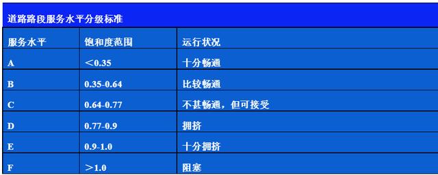 建設(shè)工程影響范圍內(nèi)道路路段、交叉口是否產(chǎn)生新的交通瓶頸點(diǎn),是否造成路段局部或交叉口某個(gè)流向交通狀況惡化,是否能夠維持道路路段或交叉口服務(wù)水平處于合理范圍。以服務(wù)水平分級(jí)作為主要評(píng)價(jià)內(nèi)容,以延誤或飽和度為基本評(píng)價(jià)指標(biāo),也可采用排隊(duì)長(zhǎng)度等指標(biāo)。