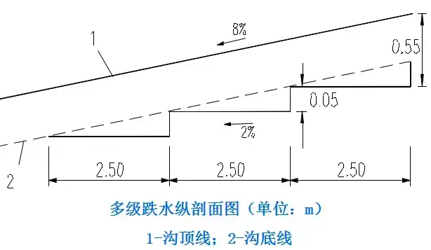 5.急流槽:在陡坡或深溝地段設(shè)置的坡度較陡、水流不離開槽底的溝槽稱作急流槽。急流槽的作用是在較短的距離內(nèi)以溝渠的方式引排水流、降低水頭,進(jìn)而防止沖刷(可用于比跌水更陡的坡度,可達(dá)600)。