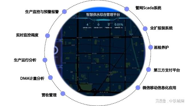 中鐵城際智慧供水平臺介紹平臺運用BIM、GIS、IOT(分布式系統、大數據分析、GIS查詢與服務、大屏數據可視化)等新一代信息技術與水務業務深度融合,通過充分挖掘數據價值,統網管控消除信息孤島,監測收集—建模分析—智能預警—應對策略,構建城市水務物聯網、城市統管一張圖,保障水務設施安全、高效、科學運行。