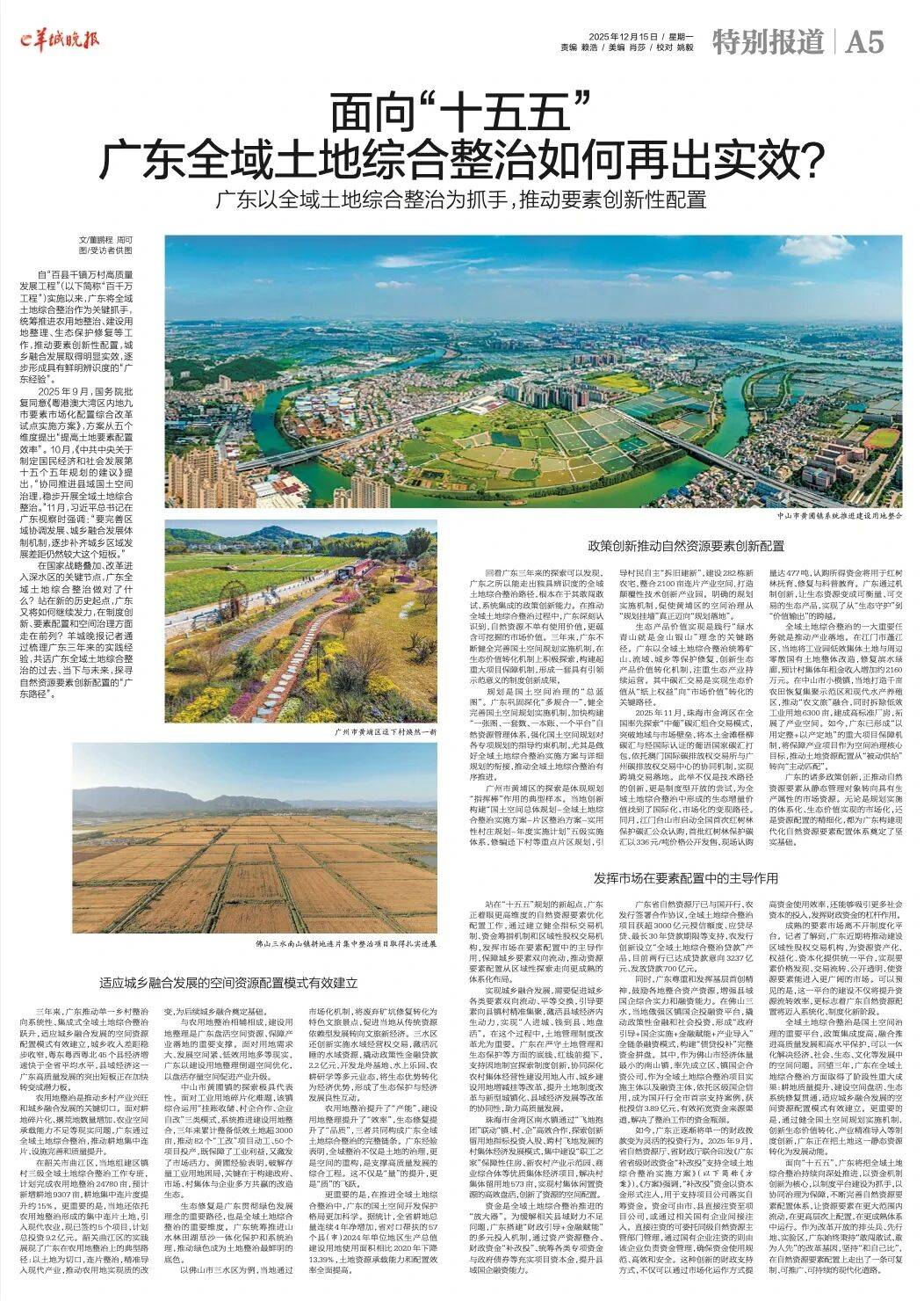 面向“十五五”,廣東將把全域土地綜合整治持續向深處推進,以資金機制創新為核心,以制度平臺建設為抓手,以協同治理為保障,不斷完善自然資源要素配置體系,讓資源要素在更大范圍內流動,在更高層次上配置,在更成熟體系中運行。作為改革開放的排頭兵、先行地、實驗區,廣東始終秉持“敢闖敢試、敢為人先”的改革基因,堅持“和自己比”,在自然資源要素配置上走出了一條可復制、可推廣、可持續的現代化道路。