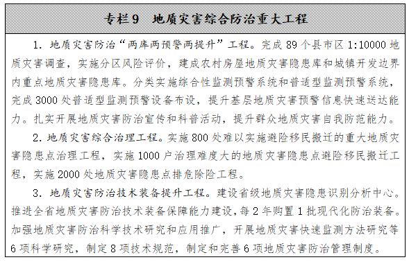 實施地質(zhì)災(zāi)害技防建設(shè)工程。推進省市縣三級地質(zhì)災(zāi)害防治技術(shù)裝備保障能力建設(shè),配置空天地一體化數(shù)據(jù)采集、傳輸、通訊、指揮等防治現(xiàn)代化專業(yè)裝備,提升地質(zhì)災(zāi)害防治信息獲取、通信保障、數(shù)據(jù)分析和技術(shù)支撐能力。為群測群防員配備升級基礎(chǔ)性裝備。